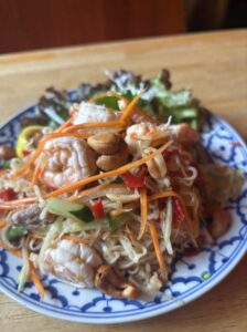 →タイの発酵調味料パラーと唐辛子のピリ辛が効いたタイラーメン(ママー)とエビののサラダです♪