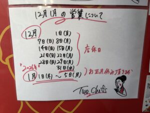 年末年始の営業について 2026年2月5日営業日twochefs Tweet いつもTwo Chefsをご利用いただきありがとうございます!コップンカップ! 年末年始の営業についてお知らせいたします。 本年もTwo Chefsをよろしくお願いいたします。 タイ料理 Two Chefs 十三東1-8-12 06-6309-5554